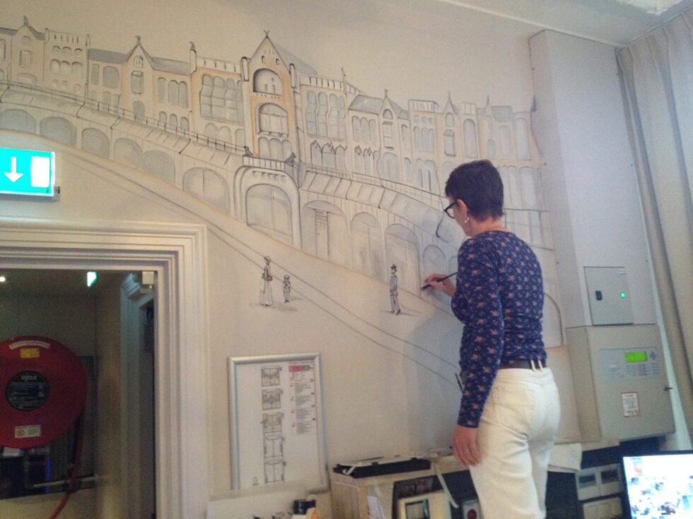 De muurschildering in kamer 207 op het filmpje heb ik werkelijk in één dag gemaakt. Ik zat hier echt in een flow. En het was ook nog eens belangrijk om dit in één dag te doen. De kamers waren namelijk continu bezet.