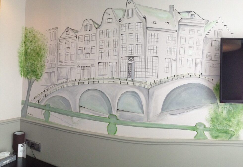 In verschillende kamers en in de lobby, heb ik Amsterdamse sferen mogen maken. Een hele prettige bijkomstigheid is dat de kamers nu zoveel ruimer lijken. Het voelde voor mij als een feest om dit te mogen doen.